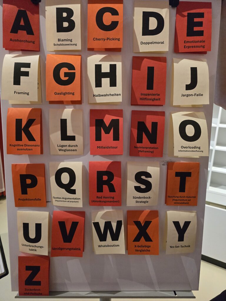 Nachdem sie in Kleingruppen an diesem frischen Morgen die Innenstadt von Bad Hersfeld erkunden durften, konnte die Klasse mit der Führung „Die Macht der Worte – Manipulation durch Sprache“ an unsere vorherige Arbeit im Unterricht in Politik und Wirtschaft, Kunst und Ethik anknüpfen. Wir lernten unter anderem das „4-Ohren-Modell“ sowie ein Alphabet der manipulativen Gesprächstechniken kennen und erfanden Werbeslogans.